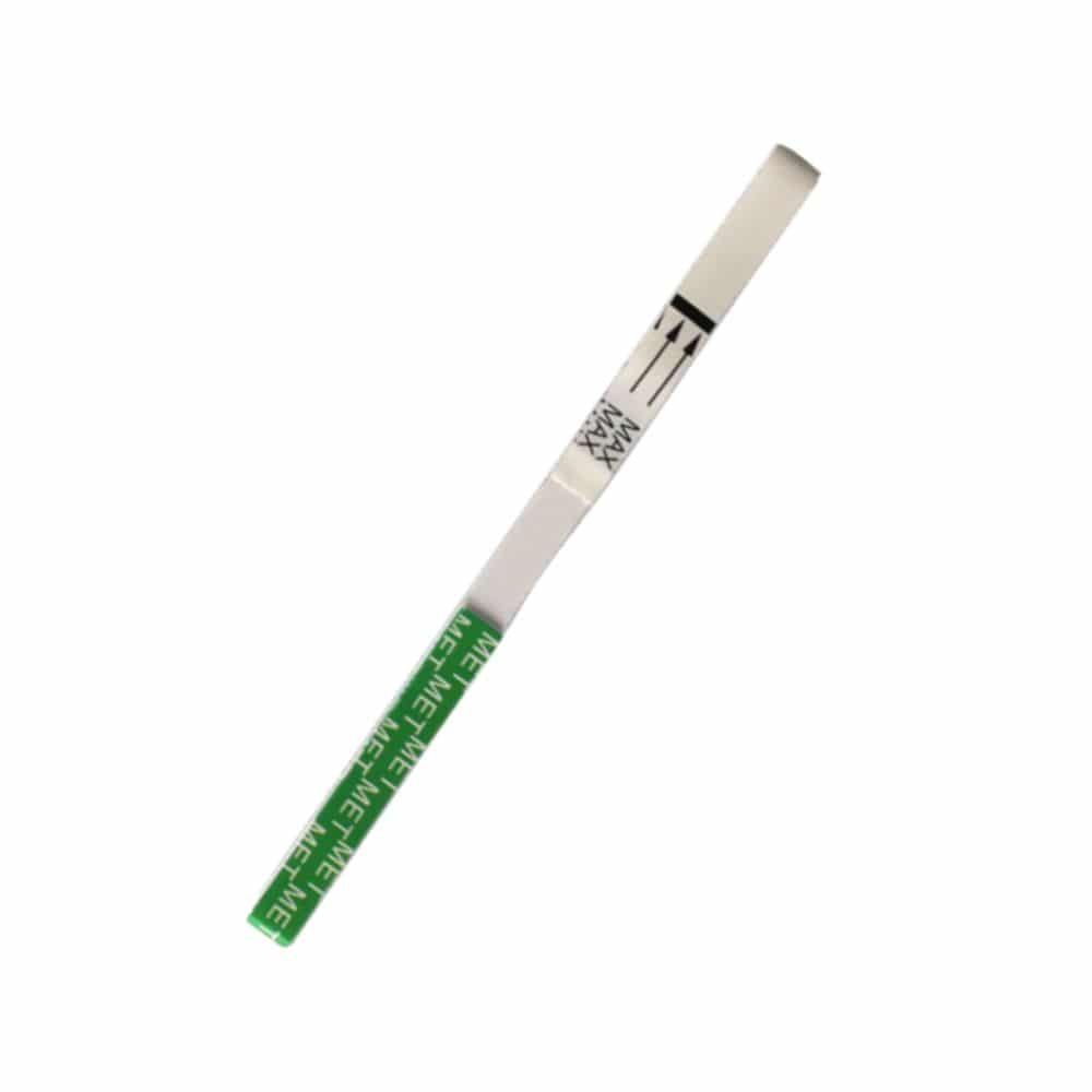 3. Then, holding the test vertically, dip the test in the urine specimen for at least 10-15 seconds. Do not immerse above the maximum line (MAX) on the test. That’s about 1/5th of the way up the test.